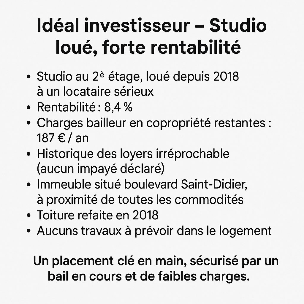 Studio au 2ᵉ étage, loué depuis 2018 à un locataire sérieux.