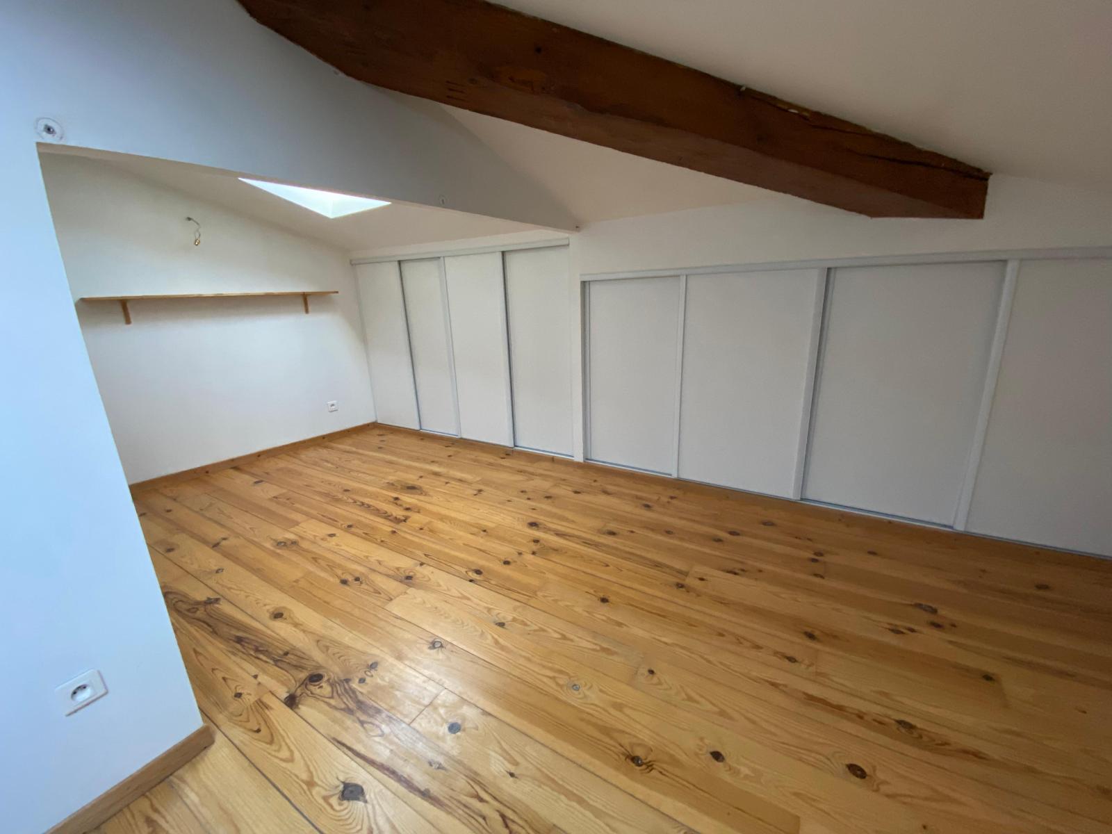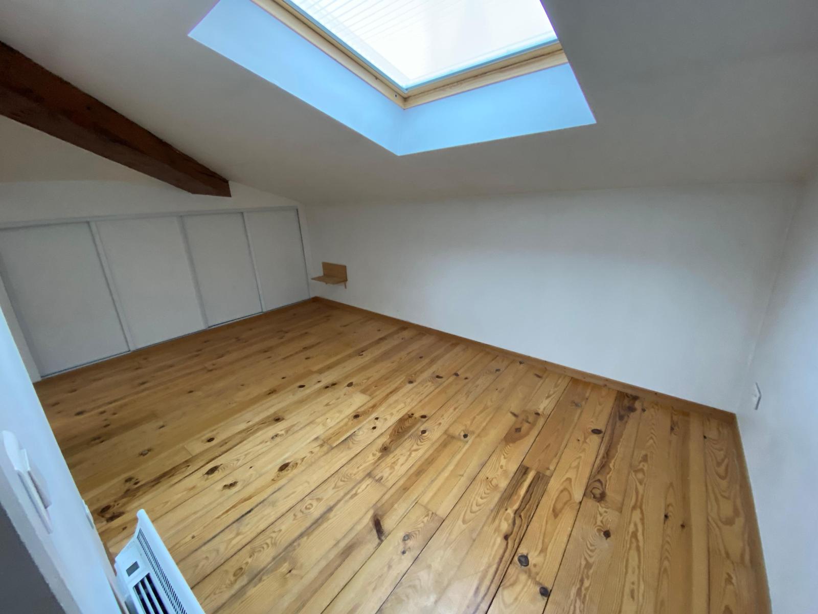 On accède à l'étage par un escalier en colimaçon pour rejoindre une grande chambre mansardée de 9 m2 avec de nombreux rangements.