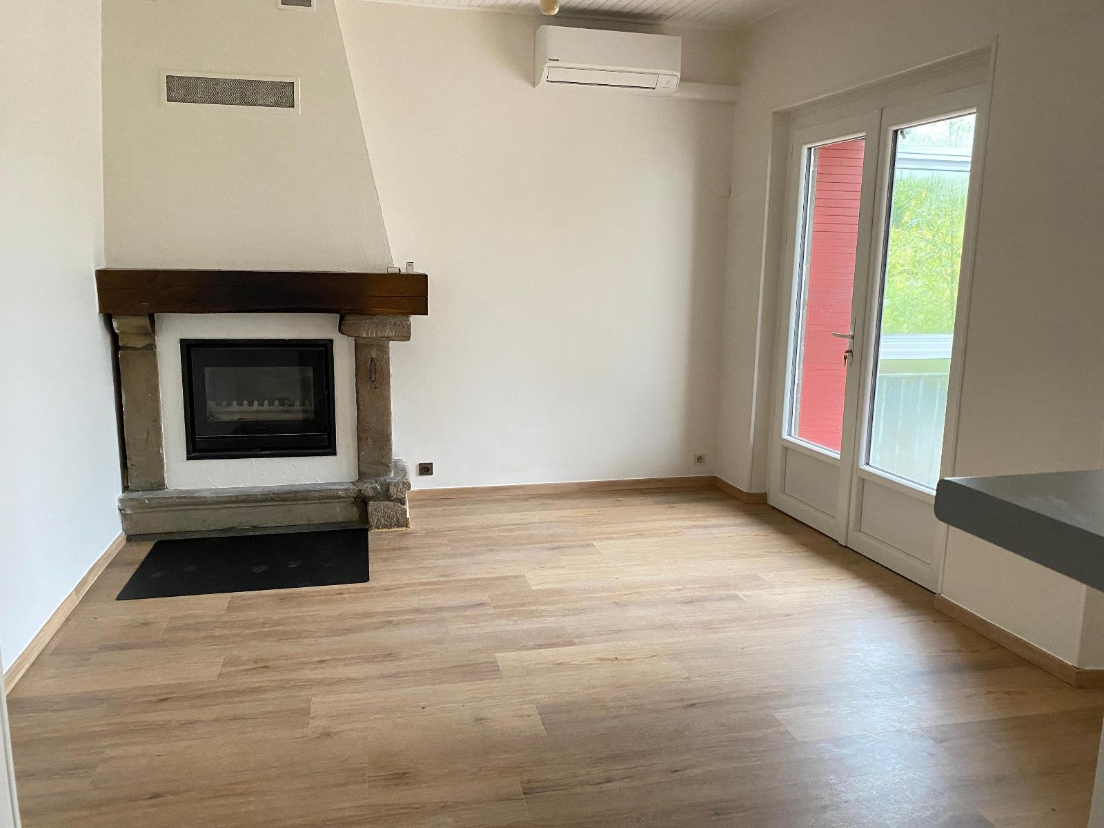 Cette maison se compose d'un coin cuisine aménagé ouvert sur un séjour avec insert, de 2 chambres et d'une salle d'eau avec wc séparé.