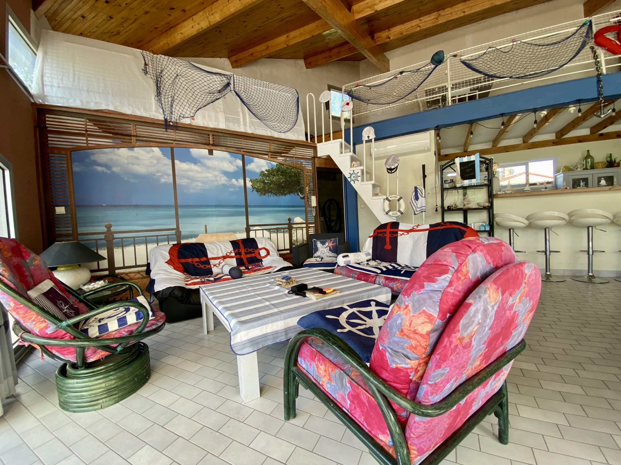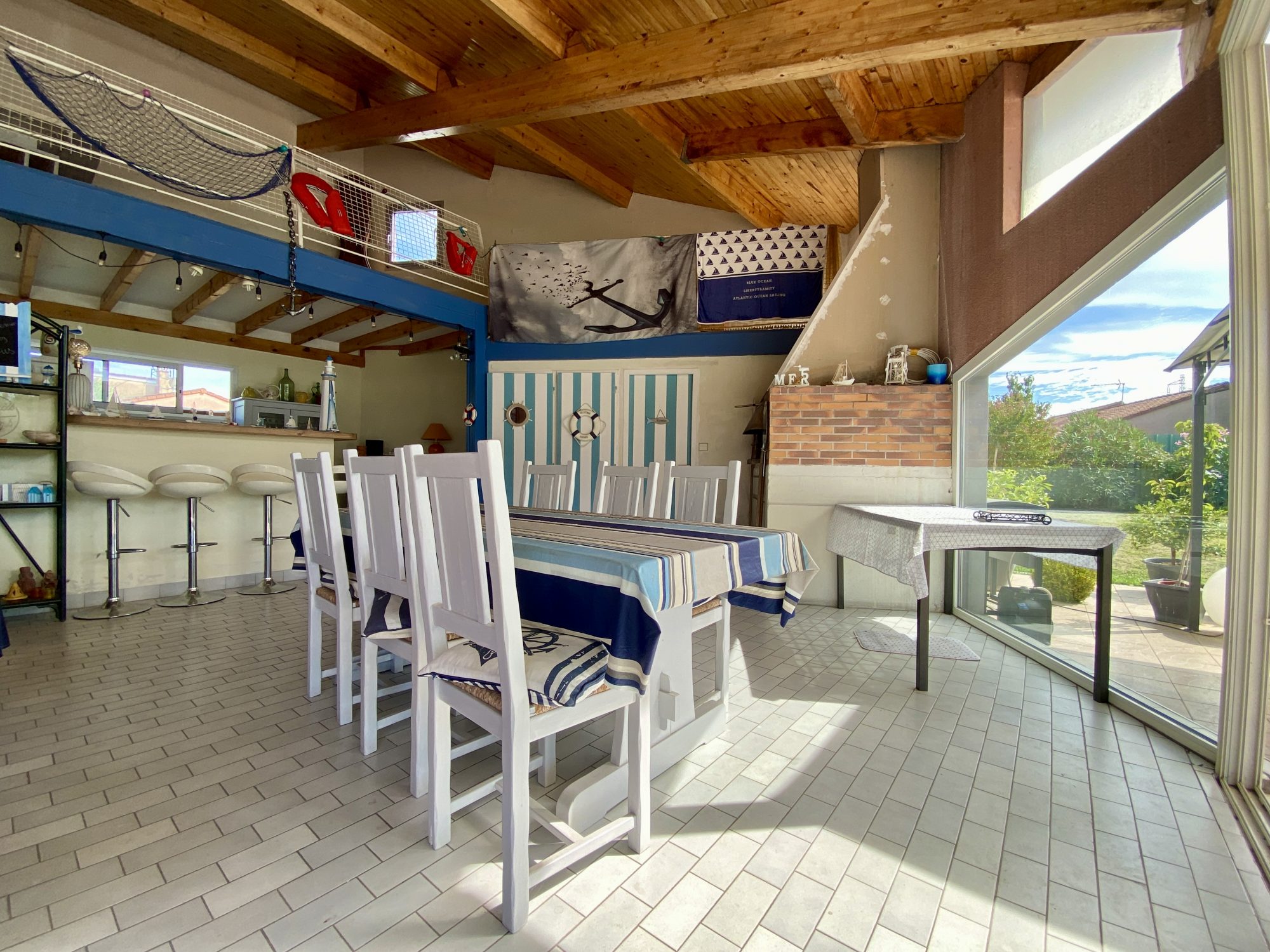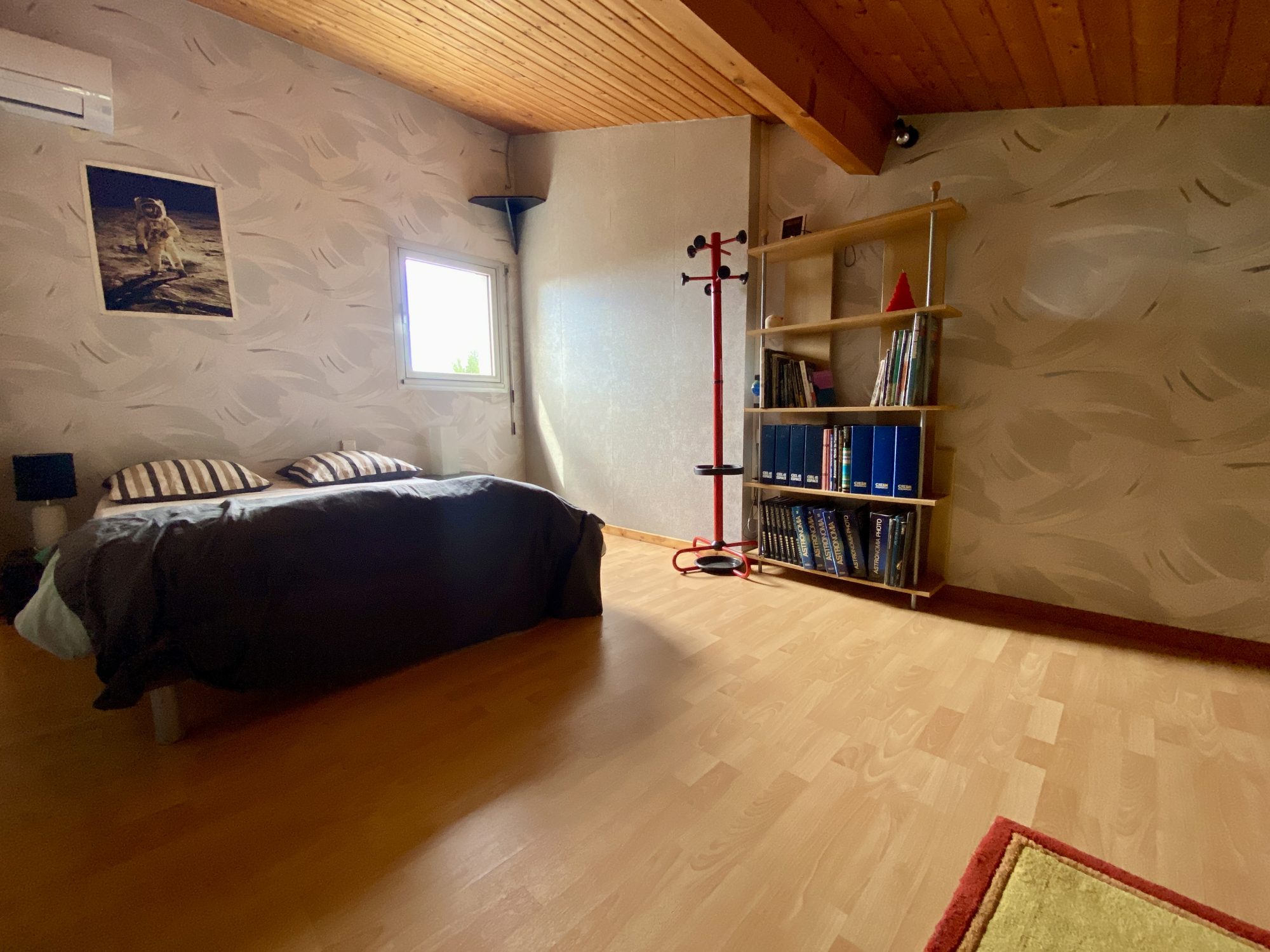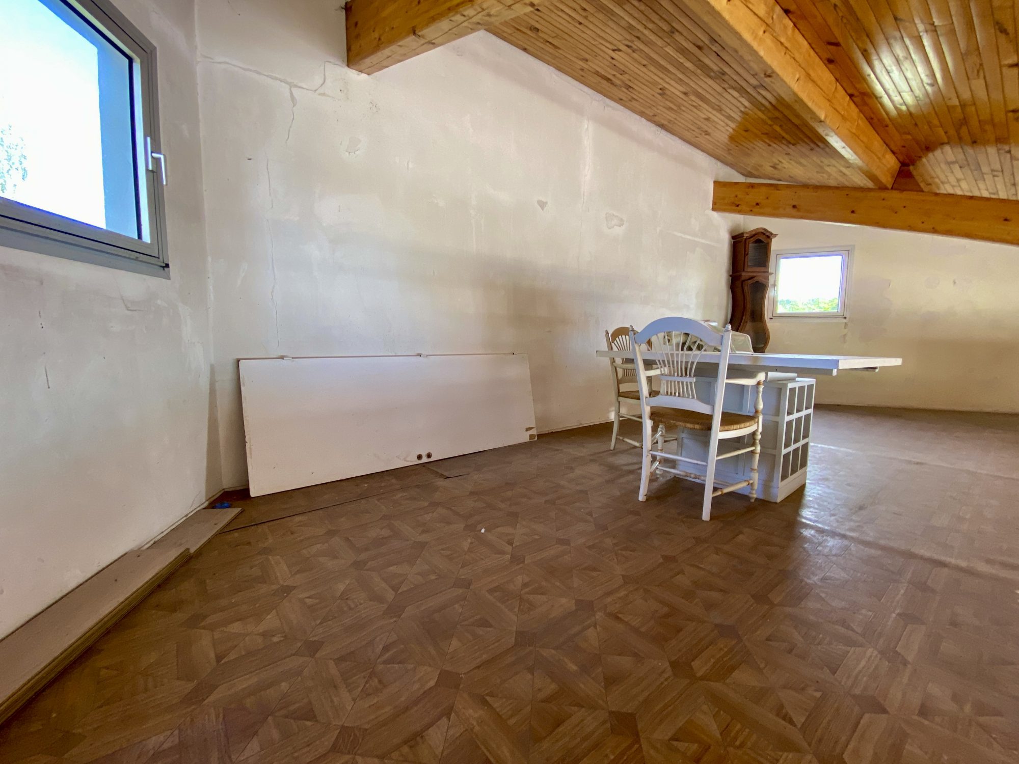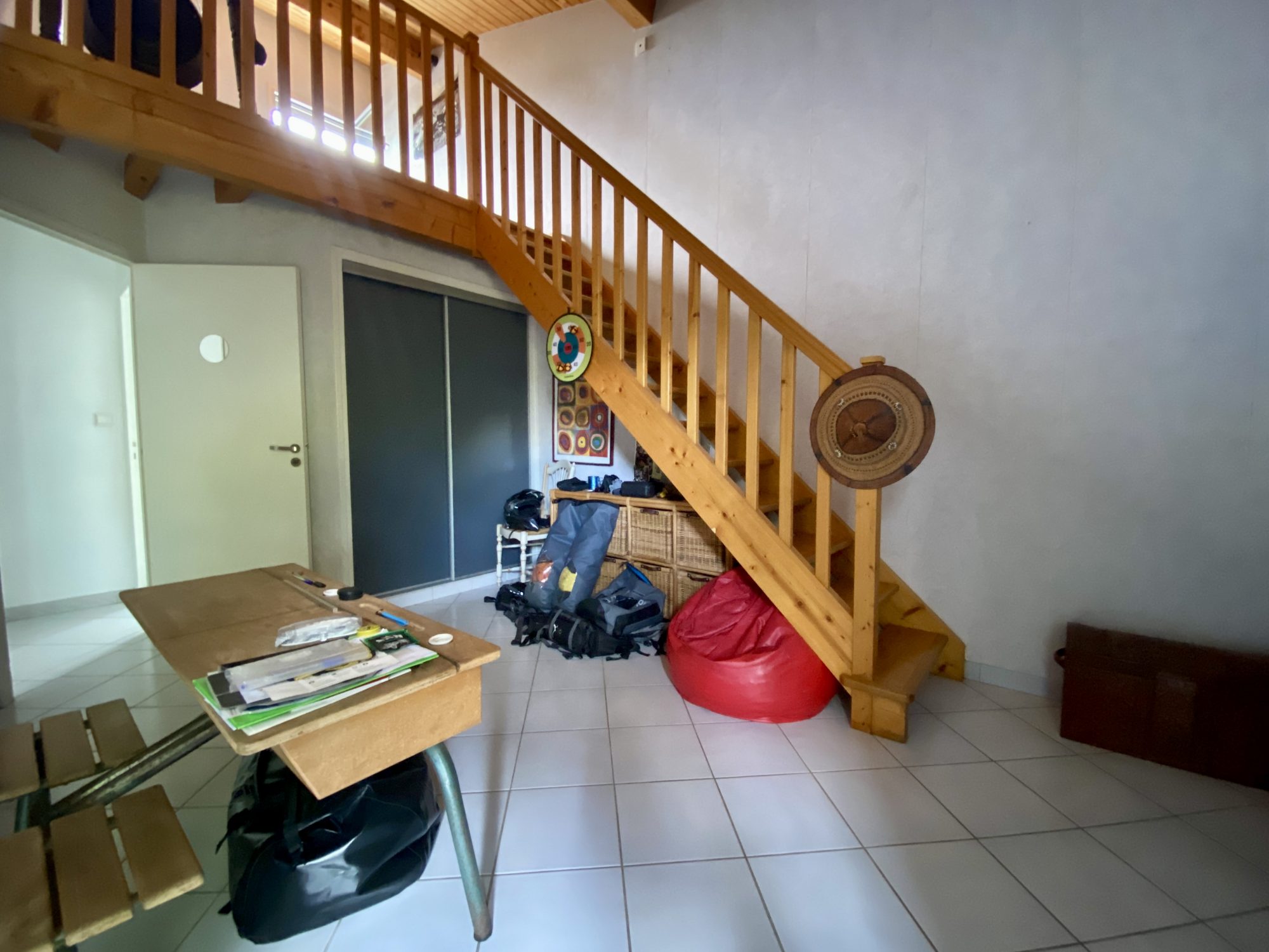 A l'étage : une spacieuse pièce de 32 m² donnant accès aux deux dernières chambres, dont une en enfilade avec l'une des mezzanine.