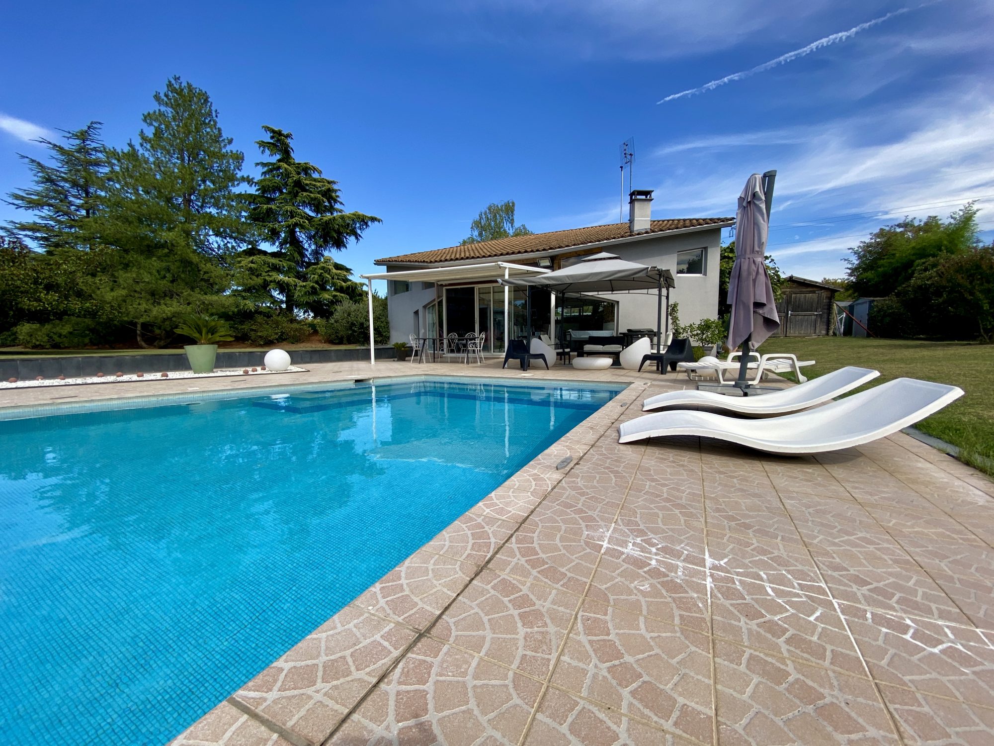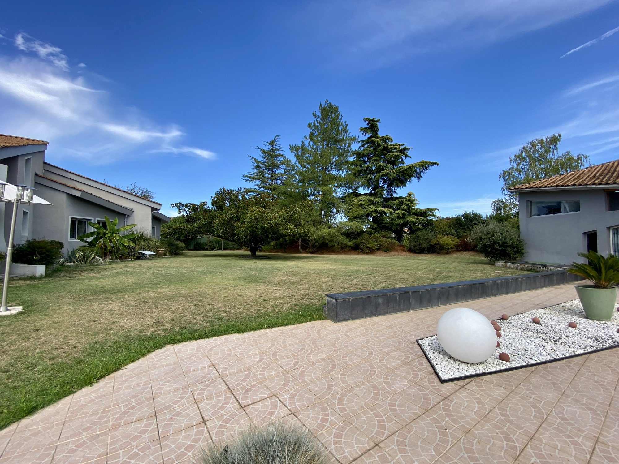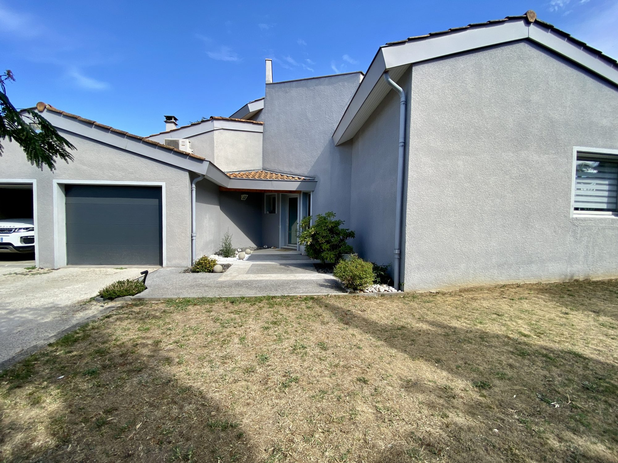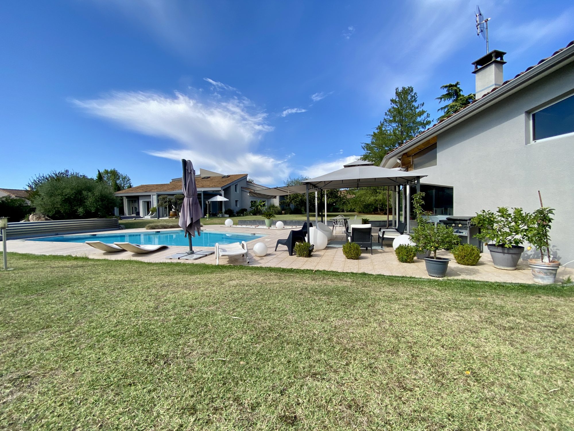 A VENDRE A BOURG DE PEAGE. Au fond d'une impasse, au calme. Sur une parcelle de 3 371 m², spacieuse maison d'architecte rénovée en 2018 (chaudière, isolation, embellissements) d'une surface au sol de 473 m² dont 370 m² habitables.