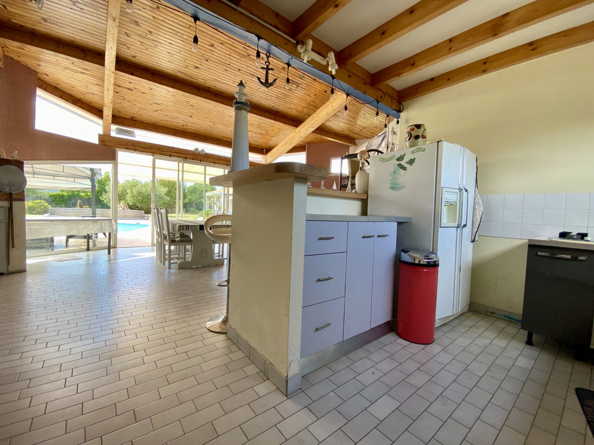 Au bord de la piscine hexagonale, le pool house se compose comme suit : une pièce de vie totalisant une superficie de 58.95 m² avec sa cuisine équipée, un local technique, une salle d'eau avec wc. A l'étage, une mezzanine offre 34 m² d'espace supplémentaire.