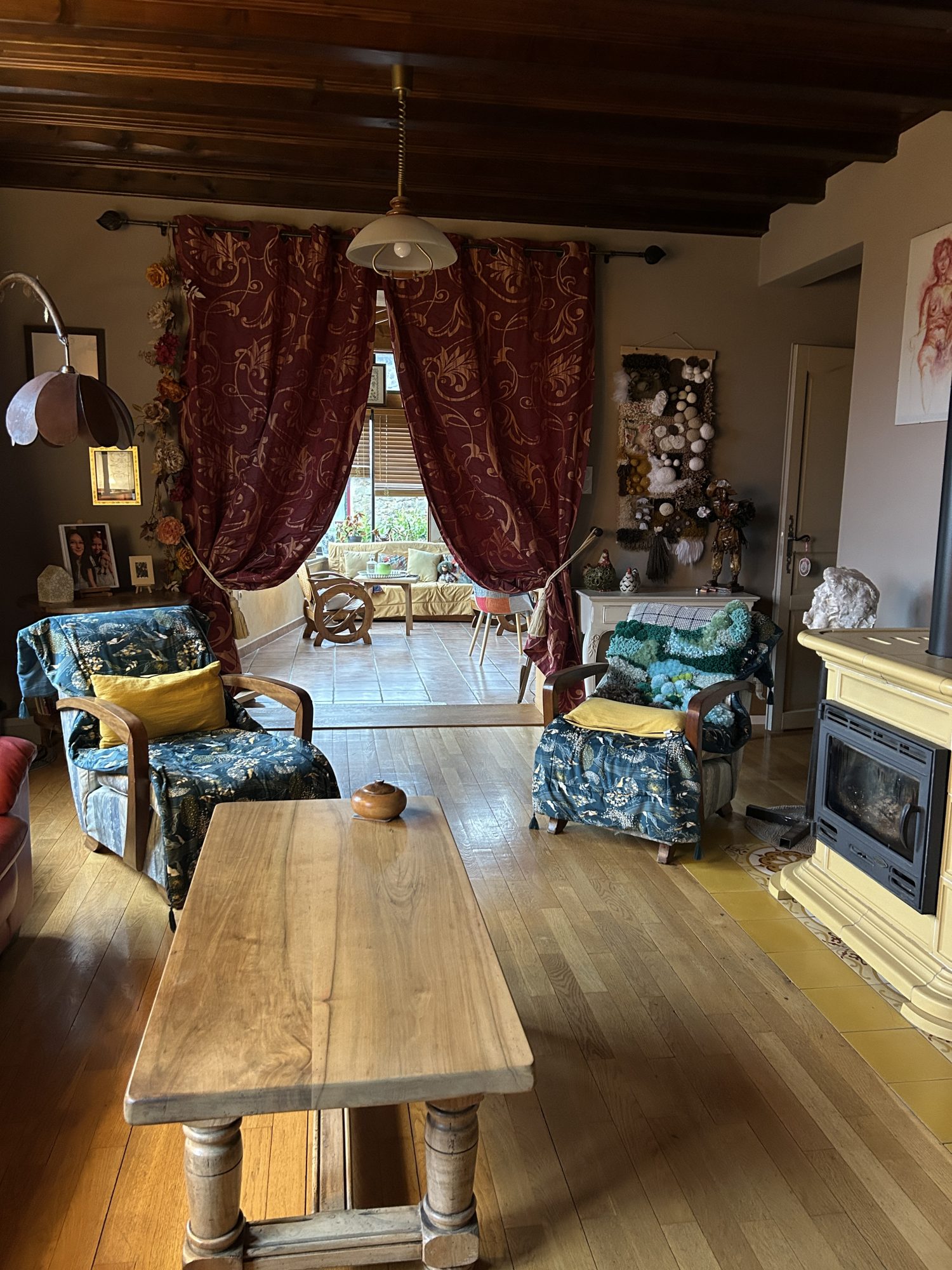 • Une pièce de vie chaleureuse de 22 m², équipée d’une cheminée Godin pour des soirées conviviales donnant directement sur la véranda lumineuse de 23 m², offrant un espace agréable en toute saison.